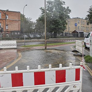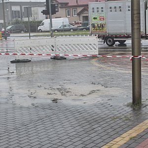 Do awarii doszło dzisiaj nad ranem. Spod kostki brukowej zaczęła tryskać woda. Prawdopodobnie przyczyną awarii jest pęknięta rura. Na skrzyżowaniu nie działają światła, jest to również prawdopodobnie efekt awarii. Uszkodzony został też hydrant, z którego woda dosłownie lała się strumieniami.