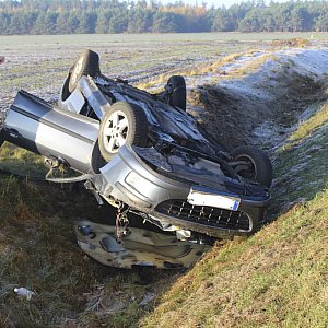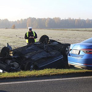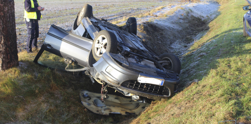 Przed godziną 8:00 na drodze krajowej 61 doszło do dachowania pojazdu, który ostatecznie zatrzymał się w przydrożnym rowie.